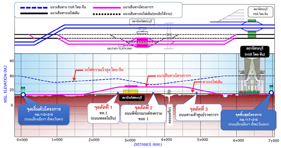 ทั้งนี้ แนวเส้นทางรถไฟยกระดับของโครงการจะซ้อนทับกับพื้นที่ชานบรรทุกทหาร (Military Platform) ที่ตั้งอยู่บริเวณสถานีสระบุรี จึงจำเป็นต้องรื้อย้าย โดยการพิจารณาพื้นที่ที่เหมาะสมสำหรับก่อสร้างชานบรรทุกทหารแห่งใหม่ ได้ข้อสรุปให้ก่อสร้างที่บริเวณสถานีชุมทางหนองบัว